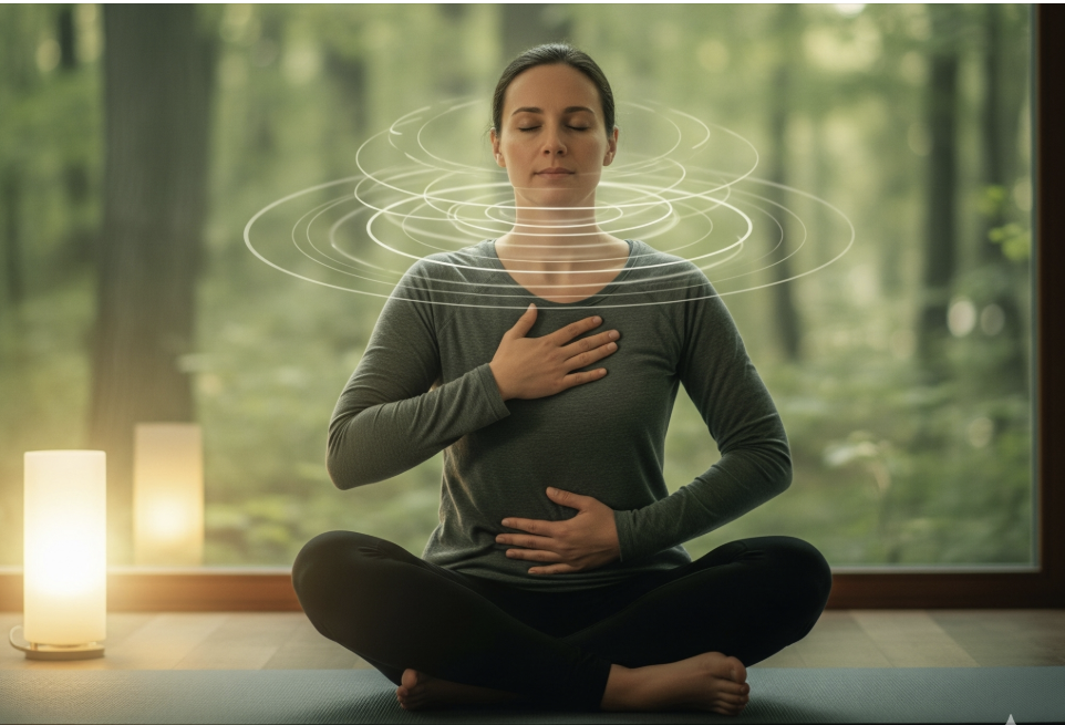 편안히 앉아 눈을 감고 복식 호흡을 시작하세요. 코로 4초 들이마시고, 입으로 6초 천천히 내쉬며 몸의 긴장을 하나씩 풀어줍니다.